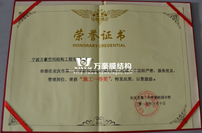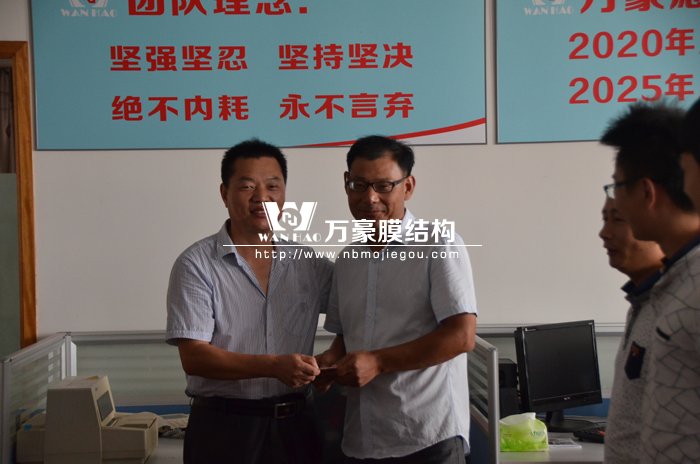 8月7日晨會上,公司對項目部汪經(jīng)理進行現(xiàn)金獎勵,汪經(jīng)理管理施工的安慶市第二中學碧桂園分校膜結構工程獲得安慶市第二中學的大力贊揚,并且頒發(fā)了“施工一等獎”的榮譽證書,表揚了我司在施工中組織嚴密、服務優(yōu)良、管理到位。