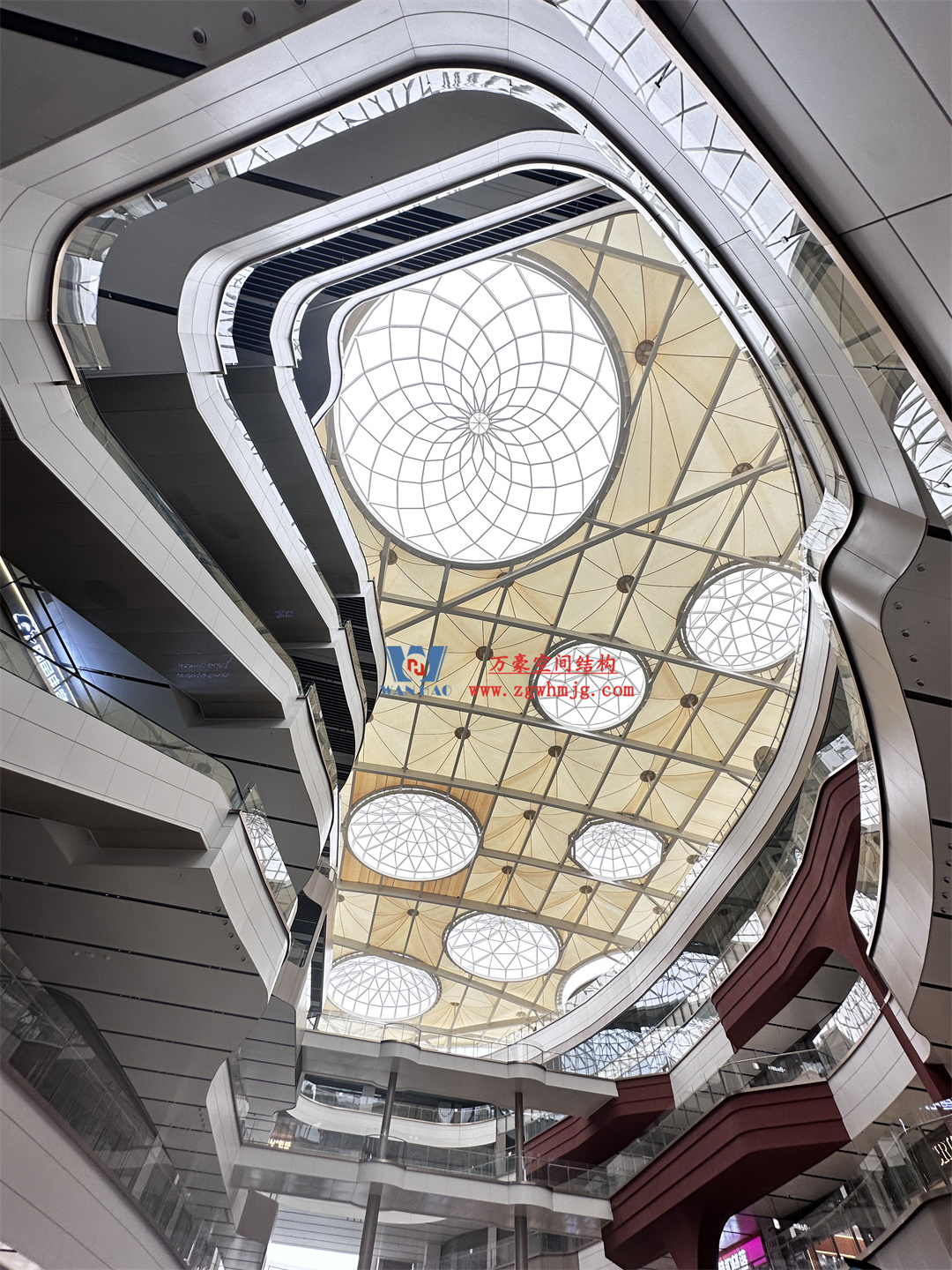 當(dāng)我們漫步在大型商業(yè)街區(qū),會發(fā)現(xiàn)越來越多的廊道或大廳頂部采用了半透明或透明的建筑材料,這些大多是膜結(jié)構(gòu)的杰作。曾經(jīng),為了滿足商場自然采光的需求,陽光板和鋼化玻璃是常用的選擇,它們能讓商場在白天更敞亮,還節(jié)省了照明設(shè)施的運行時間和能耗。然而,這些傳統(tǒng)材料也有著明顯的缺點,陽光板在陽光直射下老化速度極快,鋼化玻璃自重大,對支撐結(jié)構(gòu)要求高,安全性也是一大難題。而膜結(jié)構(gòu)的出現(xiàn),完美地解決了這些問題。PTFE 和 ETFE 膜材料不僅能夠?qū)崿F(xiàn)良好的透光性,而且重量輕,安全性更高。特別是 ETFE,它具有高自潔性和高透光性的特點,成為了大型商業(yè)街區(qū)穹頂?shù)氖走x材料。而PTFE與ETFE兩者結(jié)合互補,也是非常好的選擇。