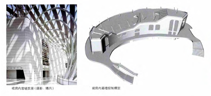 裙房內(nèi)幕墻初始的控制面由復(fù)雜的雙曲面構(gòu)成。為了能在造價允許范圍內(nèi)高質(zhì)量完成設(shè)計控制工作,依靠BIM模型的高精準(zhǔn)性,設(shè)計師們對原始的雙曲面進行了板片優(yōu)化的數(shù)據(jù)分析,確定了板片優(yōu)化的模數(shù)設(shè)置、板片平面外偏差的消納規(guī)則,最終建立起完整的干掛SRC板材幕墻體系模型,用以直接指導(dǎo)后續(xù)的生產(chǎn)加工和安裝工作。