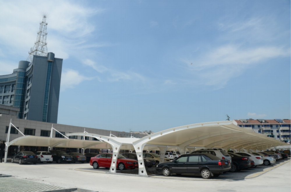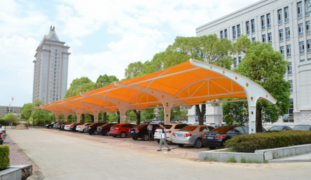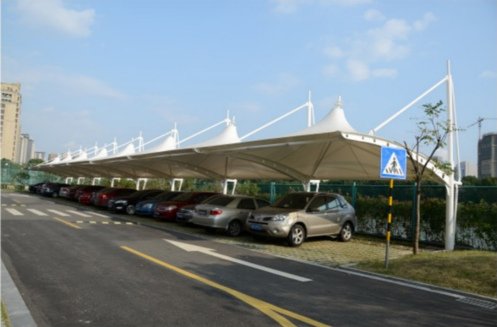第二點(diǎn),膜結(jié)構(gòu)停車棚頂部封板采用茶色(顏色可挑選)陽光板封頂,與車棚整體骨架用壓條鉚接固定,耐酸堿腐蝕,有足夠強(qiáng)度對棚內(nèi)車輛起到保護(hù)作用;
