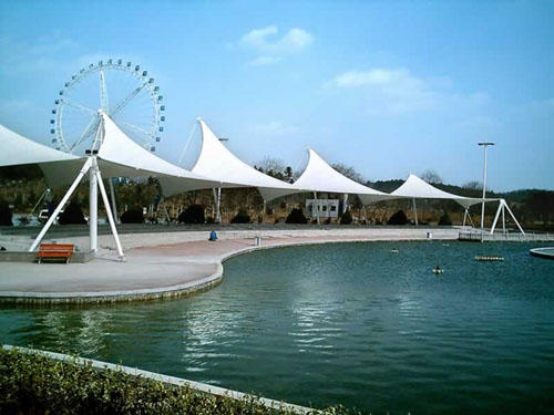 碼頭膜結(jié)構(gòu)以其獨有的優(yōu)美曲面造型,簡潔、明快、剛與柔、力與美的組合,呈現(xiàn)給人以耳目一新的感覺。碼頭膜結(jié)構(gòu)具有良好的環(huán)保性、透光性、自清潔性,膜材表面采用PVDF(聚偏二氟乙烯)涂層、或二氧化鈦涂層,具有較好的隔熱效果,對太陽熱能可反射掉70%,膜材本身吸收了17%,傳熱13%,而透光率卻在20%以上,經(jīng)過10年的太陽光直接照射,其輝度仍能保留70%。