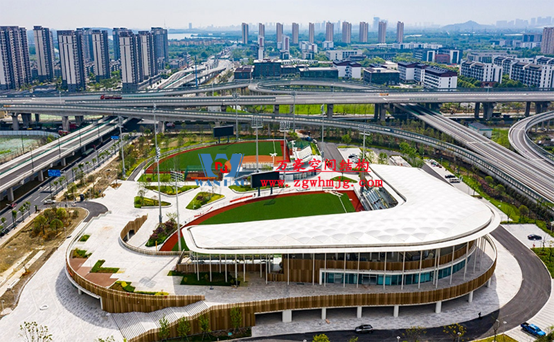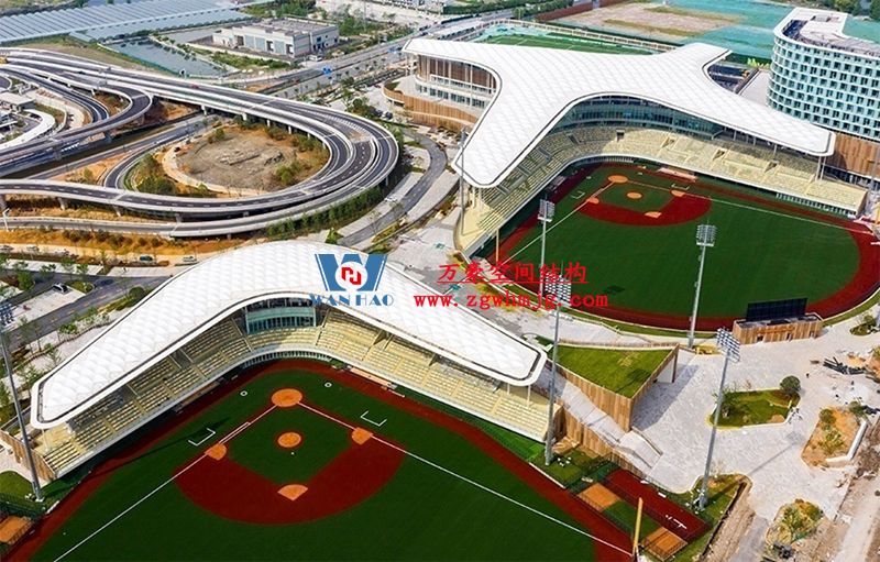 場(chǎng)館以紹興特有的絲綢、書卷為意象征,建筑立面以曲面穿孔鋁板作為主要元素。棒壘球場(chǎng)的鋼結(jié)構(gòu)膜頂,由寧波萬(wàn)豪空間結(jié)構(gòu)工程游戲有限公司承建,既作為球場(chǎng)的屋頂,又可作為平臺(tái)及其他活動(dòng)場(chǎng)所的遮蔽,頂上波紋狀膜結(jié)構(gòu),也體現(xiàn)江南水鄉(xiāng)波光粼粼的特質(zhì)。