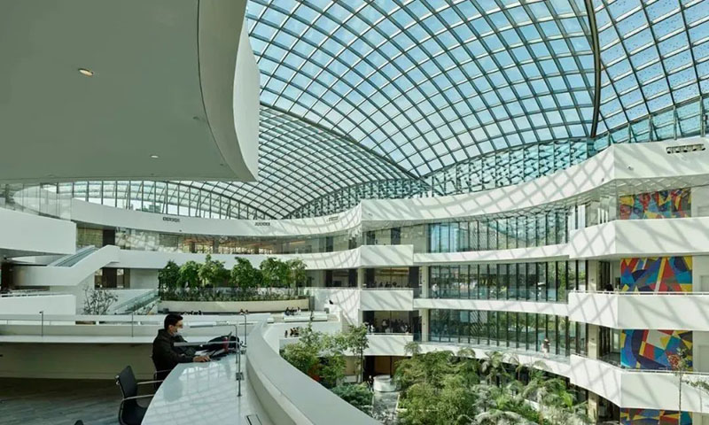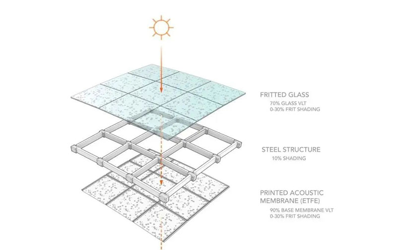 天窗內(nèi)層為透明的ETFE膜結(jié)構(gòu),其上設(shè)有微型孔洞用于吸收噪音,并印有定制的半透明圓點以輔助遮陽。天窗的穹頂中央幾近透明,而靠近東西兩端圓點密度逐漸增大,使得充足的自然光可以照向中央花園茂盛的植物,而東西方向的低角度陽光則被有效遮蔽。同時,這些圓點在自然光下形成獨特的光線效果——從下方看,層層疊疊的點狀圖案仿佛斑駁的樹影,營造出在巨樹下沐浴陽光的獨特感受。