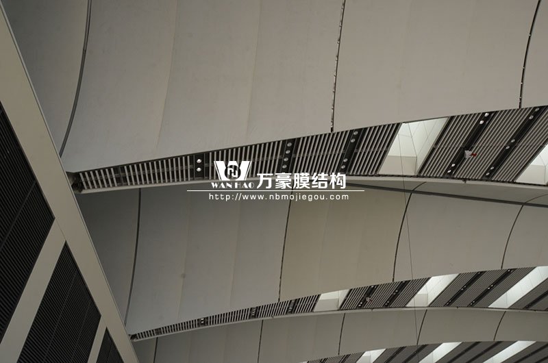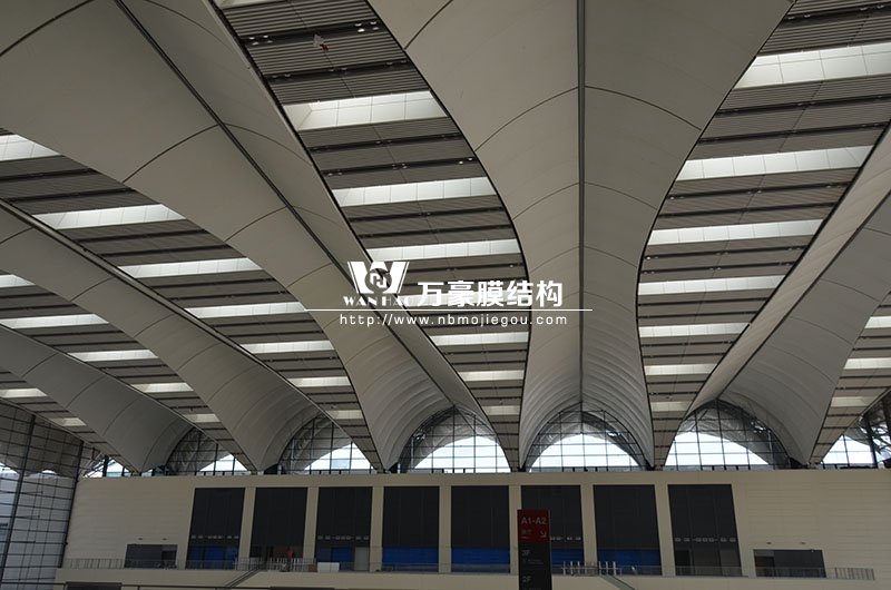 青島紅島國際會議中心幕墻膜結(jié)構(gòu)工程,由寧波萬豪空間結(jié)構(gòu)工程有限公司承建,現(xiàn)場測量、深化設(shè)計、制作及安裝由寧波萬豪全權(quán)負責(zé)。該工程用鋼量1000多噸,PTFE室內(nèi)屋面膜結(jié)構(gòu)展開面積17000多平方米,PTFE室外屋面膜結(jié)構(gòu)展開面積20000多平方米。