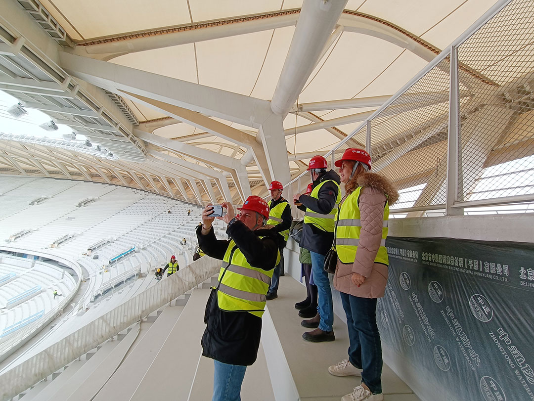1月29日,代表團(tuán)驅(qū)車前往無(wú)錫奧體中心,開(kāi)啟第二站實(shí)地考察。作為環(huán)太湖區(qū)域稀有的臨湖綜合體育場(chǎng)館群,無(wú)錫奧體中心以“白鷺振翅”為設(shè)計(jì)理念,其造型設(shè)計(jì)和承建,堪稱鋼膜結(jié)構(gòu)應(yīng)用的經(jīng)典力作。