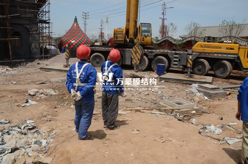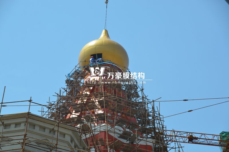 我司承建的橫店影視城圓明新園俄羅斯館已經(jīng)進(jìn)入頂部吊裝階段,本次吊裝難度極大,有著重、高、精等特點(diǎn)。本次吊裝的球體采用鋼結(jié)構(gòu)骨架和鋁合金外殼組成,自重很大,同時(shí)球體在吊裝過程不能變形,對球體前期的設(shè)計(jì)制作要求高,因其重量大,所以使用了大噸位吊車。本次吊裝高度高,很多都是高空作業(yè)。同時(shí)本次吊裝精度要求高,需要球體和底座按照設(shè)計(jì)要求完美結(jié)合,一次性完成吊裝,需要吊裝人員做好協(xié)調(diào)溝通工作,配合毫無誤差。4月17日天氣晴朗風(fēng)速低,是吊裝的有利天氣,首先吊裝相關(guān)人員設(shè)備做好準(zhǔn)備工作,之后先吊裝1號球體,在1號球吊裝完畢無誤固定后再吊裝5號球體,當(dāng)天吊裝好1號球體和5號球體。