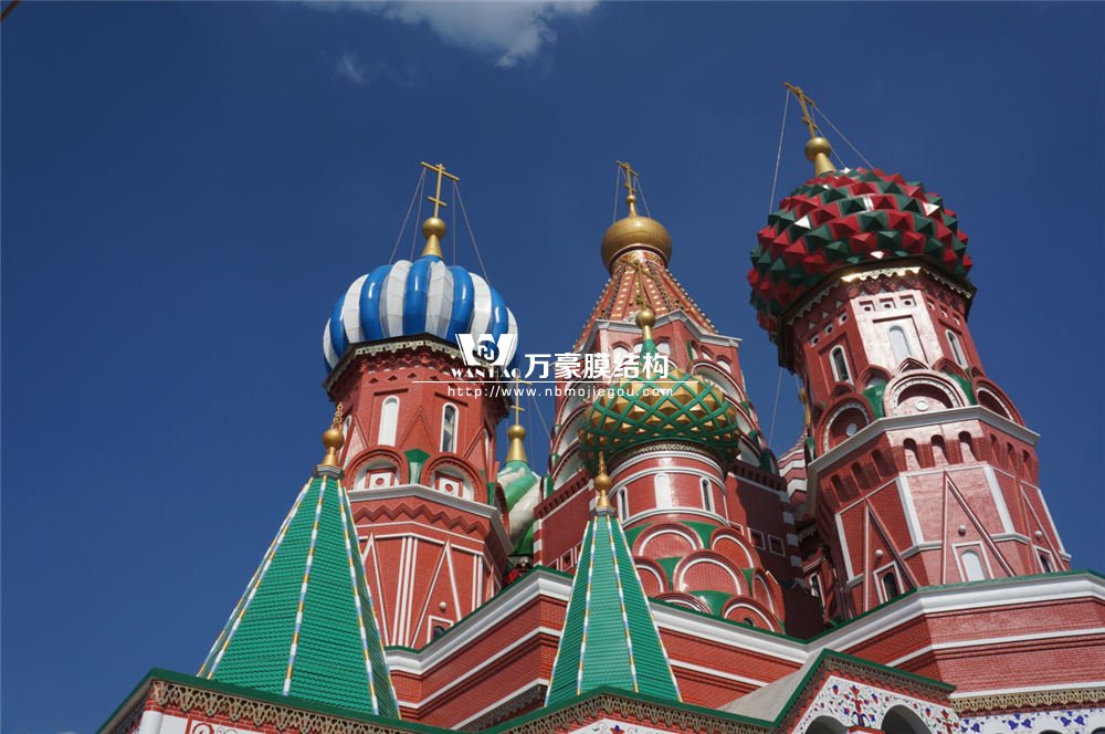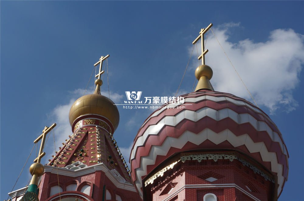 項目坐落于浙江省東陽市橫店影視城圓明新園皇家園林內(nèi),金色穹頂標(biāo)高達(dá)61.2米,單個穹頂重量達(dá)17噸。穹頂結(jié)構(gòu)充分利用鋼結(jié)構(gòu)異形特性,完美重塑俄羅斯圣瓦西里大教堂的莊嚴(yán)宏偉,完美再現(xiàn)圓明園萬國建筑的雍容華貴。