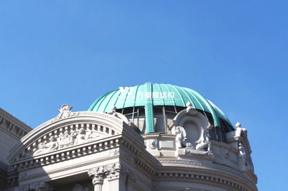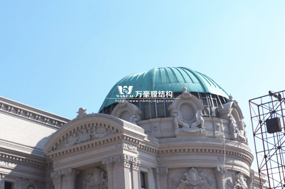 豪華的像是一個首飾盒,裝滿了各種珠寶的巴黎歌劇院目前重塑于橫店影視城圓明新園皇家園林內(nèi),其中兩側(cè)的銅綠穹頂宛如畫龍點睛般凸顯其精致、雄偉。兩個穹頂結(jié)構(gòu)相同并對稱,穹頂主結(jié)構(gòu)采用相同弧形彎管拼裝而成,結(jié)構(gòu)表面采用480塊大小各異的鋁單板組裝而成。