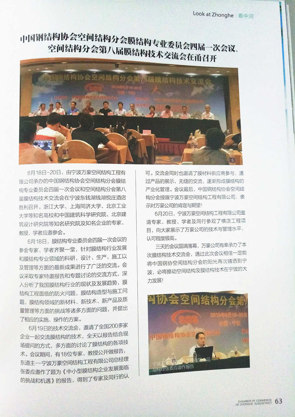 中河商薈專版以"中國鋼結構協(xié)會空間結構分會膜結構專業(yè)委員會四屆一次會議、空間結構分會第八屆膜結構技術交流會在甬召開"為題,報道了由我司主辦的第八屆膜結構技術交流會。
