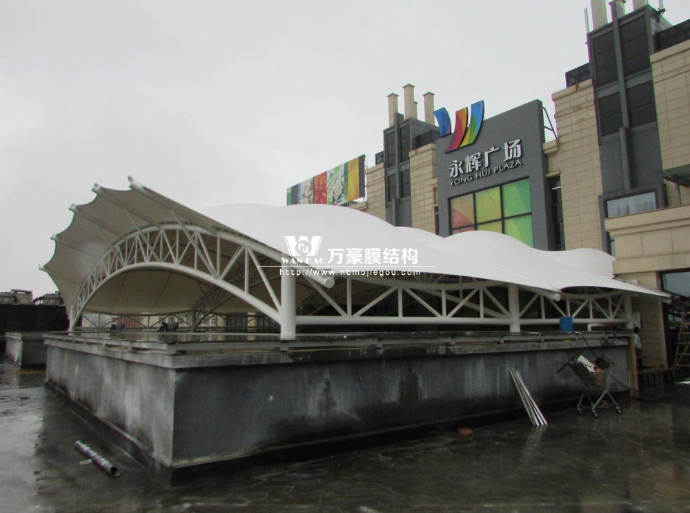 本工程系永輝超市曇石山店中庭頂棚膜結構工程,位于福建省福州市閩侯縣城新區(qū)曇石山西大道3號新永輝超市曇石山店樓頂,該工程為鋼桁架膜結構立體造型,以桁架為主要結構的骨架式單層膜結構,上面采用進口意大利耐馳膜材覆蓋??偯娣e約800平方米,鋼構約25噸。該工程施工難度較大,該樓中庭商鋪已經投入使用,大型吊車無法進入施工,只能用小型吊車加人工共同來進行施工,還有底下商鋪和地面成品保護和安全也是此次施工一大難點。用了大批的模板保護地面,同時施工時安排了安全督導人員,對客人進行引導。工程完工后,受到了業(yè)主和客人的好評!