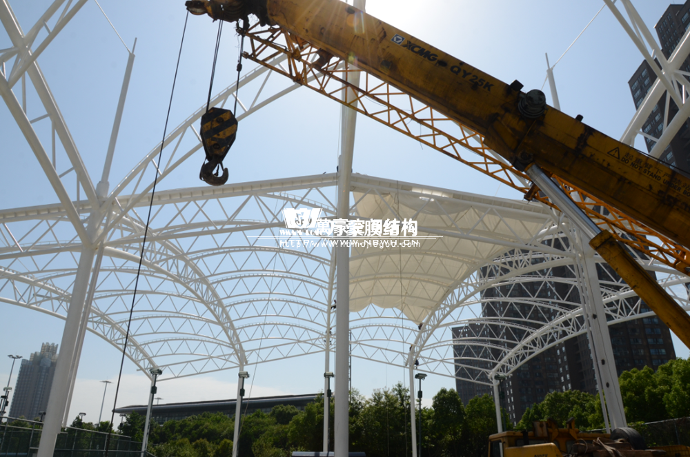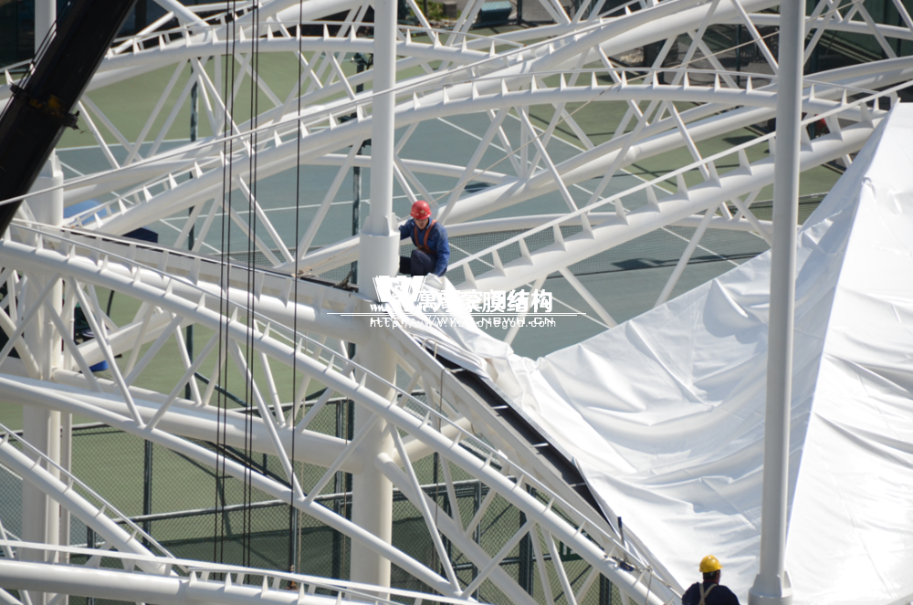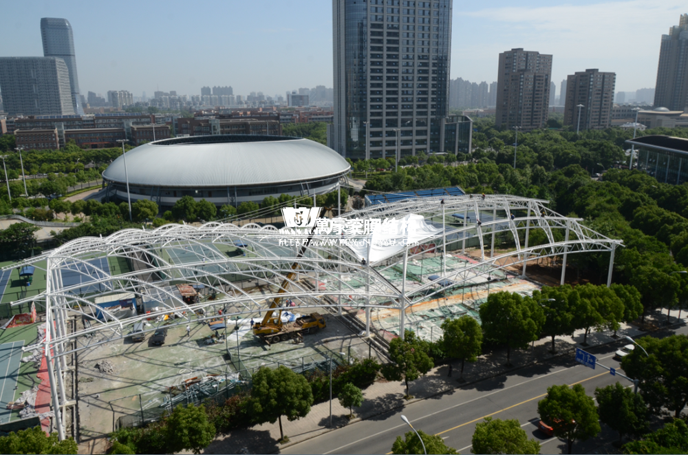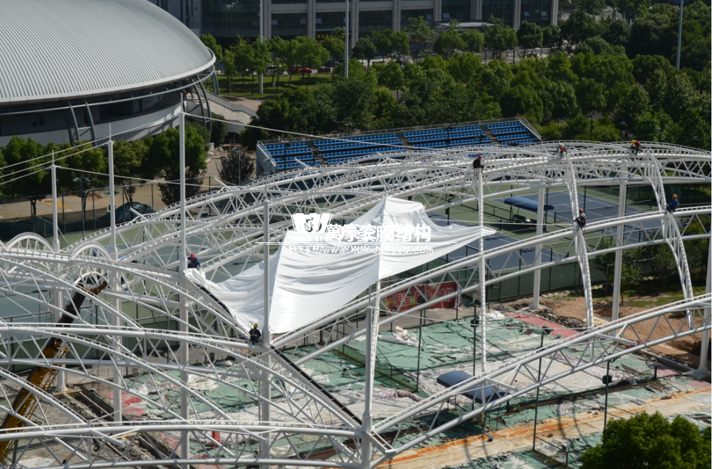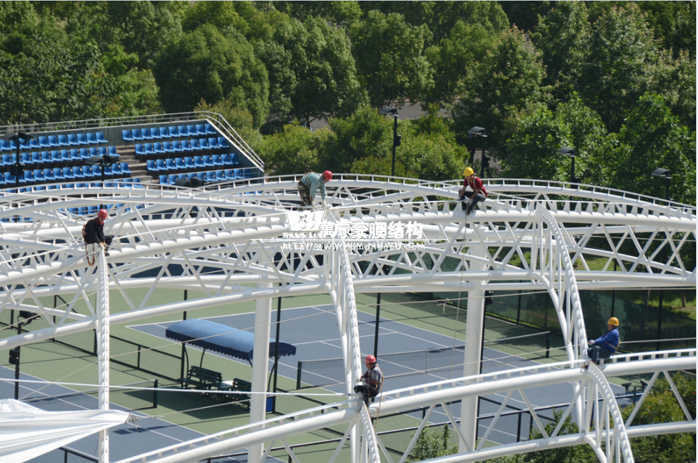 寧波(鄞州)網(wǎng)球中心遮陽棚工程位于寧波市鄞州區(qū)首南街道文華路199號【寧波(鄞州)網(wǎng)球中心內(nèi)】,整個工程用鋼量240噸,膜結構球場展開面積約6000平方米。
