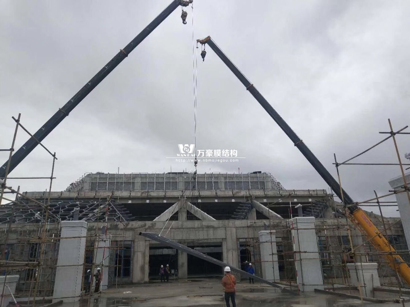 目前,主樓六邊形、二樓斜屋面每面四根大梁已全部安裝完畢,現(xiàn)在一個(gè)面的其他鋼構(gòu)正在安裝中,穹頂大梁框架完成。