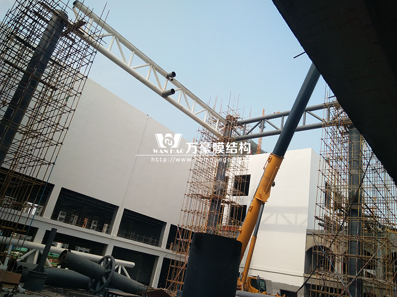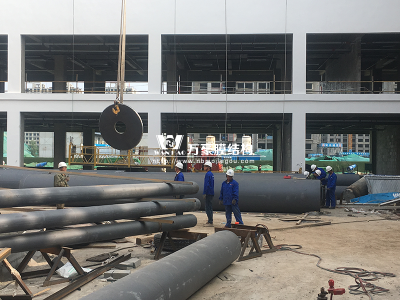 目前一號云朵鋼柱立起3根,懸挑管架全部拼裝完畢,桁架拼裝完成;二號云朵鋼柱立起3根,桁架、漏斗已基本到位,懸挑構(gòu)件焊接中;三號云朵鋼柱焊接中,隔板、環(huán)板正在有序拼裝。