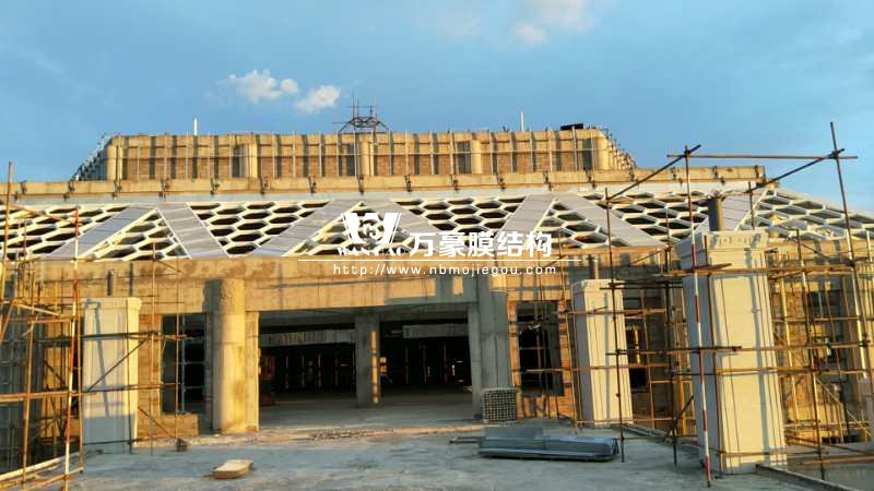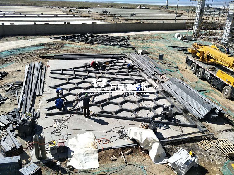 目前,觀光塔鋼膜結構項目架子已搭建完畢,接下來要做的是防護工作。綜合辦公樓鋼膜結構項目穹頂鋼構預計月底之前完成;斜屋面已做好三個面,其中兩個面已做完油漆,預計七月中旬斜屋面鋼構全部完成。