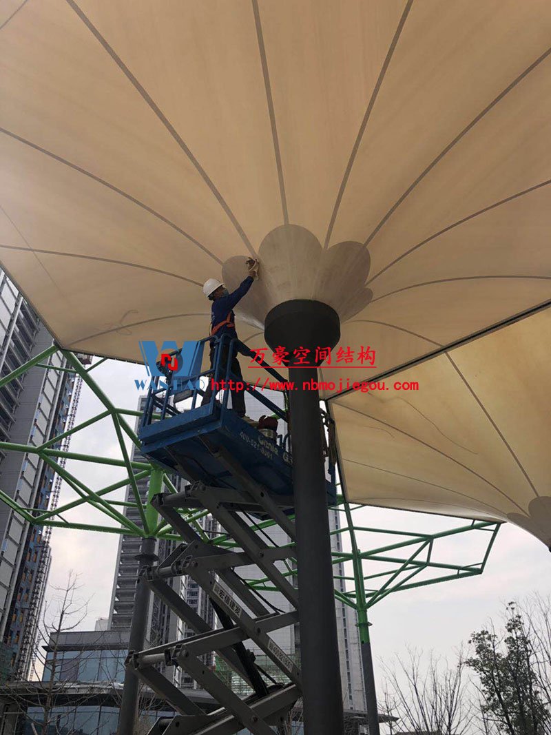 該項(xiàng)目膜材使用進(jìn)口PTFE膜材,膜結(jié)構(gòu)展開面積5000平米,用鋼量100噸,由寧波萬豪空間結(jié)構(gòu)工程有限公司承建。